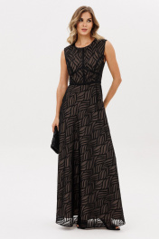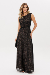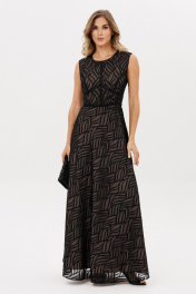Платье выполнено из шифона с жаккардовым рисунком. Платье Х-образного силуэта, отрезное по линии талии, длиной миди. Спереди средний шов и горизонтальный подрез. Застежка на потайную молнию сзади в среднем шве спинки и юбки. Горловина округлой формы. Юбка расширена к низу и выкроена по косой. Платье декорировано настрочной тесьмой по всем резным линиям лифа и линии талии. Платье на отлетной по низу подккладке телесного цвета. Длина платья -146 см. 44 46 48 Длина по центру спинки 146 146 146 Длина рукава Объем по груди 92 96 100 Объем по талии 72 76 80 Объем по бедрам 112 116 120 Объем по низу 224 228 232