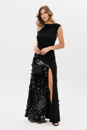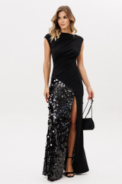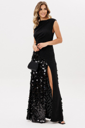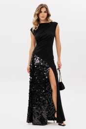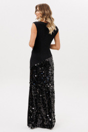 Платье выполнено из комбинации двух тканей: трикотажного полотна с блеском и крупных пайеток на сетке. Платье приталенного силуэта длиной в пол. Перед и спинка ассиметричные. Спереди драпировки от плеча и от линии талии. Горловина формы ""лодочка"". Правый плечевой шов удлинен. Нижняя часть платья на отлетной по низу подкладке. Длина платья: р. 42-46 - 148 см, р. 48-52 -149,5 см. Гарантийный срок не установлен ГОСТ 31409-2009