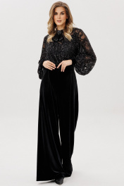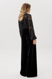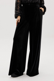 Брюки-палаццо выполнены из бархата. Брюки на притачном поясе, длиной в пол, расширенные к низу. Спереди складки и боковые карманы с наклонным входом. Застежка спереди на молнию с гульфиком и пуговицу. На задних частях обработаны талиевые вытачки. Длина брюк: р. 44-48 - 111 см, р. 50-54 - 112 см Гарантийный срок не установлен ГОСТ 25294 - 2003