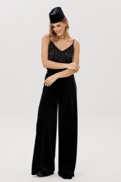 Брюки-палаццо выполнены из бархата. Брюки на притачном поясе, длиной в пол, расширенные к низу. Спереди складки и боковые карманы с наклонным входом. Застежка спереди на молнию с гульфиком и пуговицу. На задних частях обработаны талиевые вытачки. Длина брюк: р. 44-48 - 111 см, р. 50-54 - 112 см Гарантийный срок не установлен ГОСТ 25294 - 2003