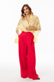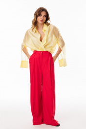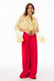 Блузка + топ. Блузка выполнена из креш-органзы. Блузка прямого силуэта, длиной выше линии бедер. Перед и спинка цельные. Спереди прорезь. Воротник-стойка, переходящий в бант. Рукав втачной, одношовный, расширенный к низу и присборенный. Низ рукава на притачной манжете, застегивающейся на четыре пуговицы. В комплект входит топ на регулируемых бретелях. Перед и спинка топа цельные. Длина блузки: р.42-46 - 70 см, р.48-52 - 71 см. Длина рукава: р.42-46 - 71 см, р.48-52 - 72 см. БЛУЗКА м. 3035 42 44 46 48 50 52 Длина по центру спинки 72 72 72 73 73 73 Длина рукава 75 75 75 76 76 76 Объем по груди 93/92 97/96 101/100 105/104 109/108 113/112 Объем по талии 94/92 98/96 102/100 106/104 110/108 114/112 Объем по низу 102/99 106/103 112/107 114/111 118/115 122/119 Объем рукава вверху 35 37 39 39 41 43 Объем рукава внизу 21 21 21 23 23 23