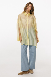 Блузка выполнена из плательно-блузочной ткани. Блузка прямого силуэта, покроя оверсайз, длиной ниже линии бедер. Спереди центральная застежка на пуговицы. Спинка цельная, длиннее переда. Воротник стояче-отложной. Плечевой шов спущен. Рукав рубашечного покроя, двухшовный, с прорезью по переду. Низ рукава на притачной манжете, застегивающейся на пуговицу. В боковых швах разрезы. Длина блузки: р.44-48 - 79 см, р.50-54 -80 см. Длина рукава от горловины: р.44-48 -78 см, р.50-54 -79 см. БЛУЗКА м. 3036 44 46 48 50 52 54 Длина по центру спинки 84 84 84 85 85 85 Длина рукава от горловины 79 79 79 80 80 80 Объем по груди 142 146 150 154 158 162 Объем по талии 140 144 148 152 156 160 Объем по низу 140 144 148 152 156 160 Объем рукава вверху 34 36 38 38 40 42 Объем рукава внизу 23,5 23,5 23,5 25,5 25,5 25,5