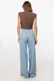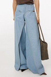 Джинсы-клеш выполнены из плотного джинса. Брюки на притачном поясе, длиной до пола, расширенные к низу. Спереди верхние отлетные части, боковые карманы с фигурным входом. Застежка на пуговицу и молнию с гульфиком. На задних частях кокетки и накладные карманы. По переду брюки декорированы брендированной нашивкой из натуральной кожи. Длина брюк: р.44-48 - 102 см, р. 50-54 - 103,5 см БРЮКИ м. 3044 44 46 48 50 52 54 Длина сбоку с поясом 110 110 110 111,5 111,5 111,5 Объем по талии 64-78 68/82 72/86 76/90 80/94 84/98 Объем по бедрам 106 110 114 118 122 126 Ширина пояса 4 4 4 4 4 4