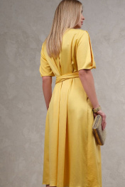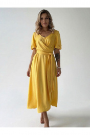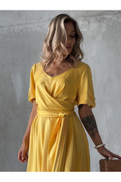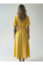 Платье длиной до середины икры А-силуэта, отрезное по линии талии. Фигурный вырез горловины переходит в пояс-завязку. Рукав короткий, в боковых швах кармана.