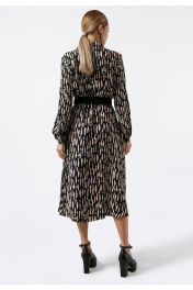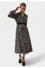 Стильное платье миди с оригинальным абстрактным принтом в черно-белой гамме. Модель приталенного кроя с классическим воротником и длинными рукавами на манжетах. Акцент на талии создаёт широкий чёрный ремень с пряжкой, подчёркивающий женственную фигуру. Лёгкая и струящаяся ткань обеспечивает комфорт и элегантность в носке. Идеальный выбор для создания утончённого образа как на каждый день, так и для особых случаев.