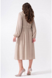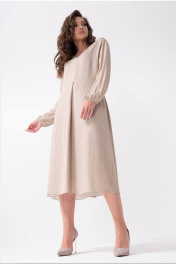 Платье из лёгкой плательной ткани А-образного силуэта длиной миди. Перед цельнокроёный с глубокой складкой по центру и небольшими отлетными кокетками. Спинка отрезная, по линии талии собрана широкой эластичной тесьмой. Вырез горловины V-образный. Рукав втачной, прямой, низ собран эластичной тесьмой. Длина платья по спинке во всех размерах - 117 см. Рукав 61см