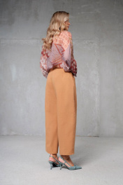 Брюки женские. Силуэта "бананы". Спереди декоративные рельефы, карманы с отрезным бочком. Сзади декоративние вытачки. Брюки на притачном поясе с застежкой впереди. На плясе-шлевки для ремня.
