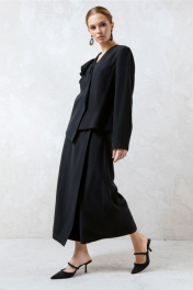 Элегантная чёрная миди длины макси-миди, выполненная в минималистичном стиле. Прямая, слегка расклёшенная к низу форма создаёт плавный, вытянутый силуэт. Длина — около щиколоток, что смотрится сдержанно и очень утончённо. Посадка высокая, что подчёркивает талию и идеально сочетается с ремнём и блузой. Спереди заметен лаконичный асимметричный запах или мягкая складка, добавляющая визуальную динамику. Юбка выглядит строго, изысканно и универсально — такую легко вписать как в деловой образ, так и в вечерний минималистичный комплект.