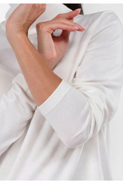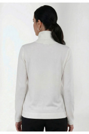 Трикотажный гольф полуприлегающего силуэта с воротником хомут. Трикотаж средней плотности, теплый, хорошо тянется. Рукав втачной. Длина изделия по спинке в 44-46-48 размерах 56 см, в 50-52-54 размерах 58 см.