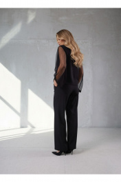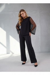 Стильная чёрная блуза с акцентными прозрачными рукавами. Основные детали: Основная часть: выполнена из плотной матовой ткани, свободного прямого кроя. Рукава: главное украшение модели — длинные объёмные рукава из сетки с мелким рисунком. Они полупрозрачные, воздушные и слегка расклёшенные, создают эффект лёгкости и добавляют блузе нарядности. Манжеты: узкие, аккуратные, фиксируют форму рукавов. Горловина: круглая и лаконичная, подчёркивает шейную линию. Силуэт: свободный, комфортный, хорошо драпируется по фигуре. Блуза выглядит женственно и элегантно — отлично подходит как для вечерних образов, так и для стильных деловых или праздничных сочетаний.
