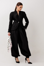Жакет приталенный ERTANNO — изящная модель с выразительной архитектурой силуэта. Приталенный крой малого объёма мягко подчёркивает фигуру, создавая элегантный и современный образ. Рельефные линии спереди и спинке формируют аккуратную посадку, а расширенная линия плеч добавляет силуэту уверенности и стильного характера. Длинные рукава полуреглан с изящной шлицей и пуговицами по низу делают модель особенно утончённой. Цельнокроеный воротник-стойка придаёт жакету лаконичность и благородную строгость, а центральная застёжка на пуговицу завершает образ аккуратным акцентом. Жакет на подкладке идеально сидит по фигуре и легко вписывается как в деловые, так и в более элегантные повседневные образы.На модели размер 44 Параметры модели: рост-175см, 82-67-91 . Брюки «шаровары» ERTANNO — это идеальное сочетание свободы, комфорта и современного стиля. Лёгкий свободный силуэт мягко струится по фигуре, создавая расслабленный, но при этом очень стильный образ. Модель длиной до щиколотки выглядит актуально и легко вписывается в гардероб — такие брюки одинаково красиво смотрятся и с лаконичными топами, и с жакетами. Цельнокроеный пояс с мягкой эластичной тесьмой деликатно подчёркивает линию талии и обеспечивает комфортную посадку без лишнего давления. Немного спущенная линия талии и слегка заниженный шов сидения добавляют образу современную непринуждённость, а удобные карманы в боковых швах делают модель практичной для повседневной жизни. По низу брюк расположена цельнокроеная манжета на эластичной тесьме, благодаря которой брюки красиво собираются и создают мягкий, стильный объём. Это именно те брюки, которые хочется надевать снова и снова — лёгкие, удобные и невероятно стильные.На модели размер 44 Параметры модели: рост-175см, 82-67-91