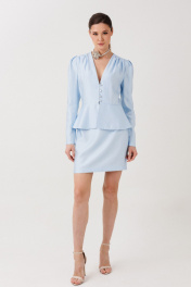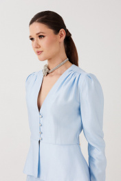 Жакет с баской прилегающего силуэта ERTANNO выполнена в красивом нежном голубом оттенке, который придаёт образу свежесть, лёгкость и утончённую женственность. Этот мягкий цвет напоминает ясное летнее небо и делает образ светлым, элегантным и очень стильным. Модель дополнена отрезной кокеткой, по верхнему краю которой выполнена деликатная сборка, создающая мягкий объём и лёгкость. Глубокий V-образный вырез красиво подчёркивает линию шеи и декольте. Центральная застёжка на навесные петли и пуговицы добавляет изящный акцент. Длинные втачные рукава со складками по окату мягко сужаются к низу, создавая элегантный силуэт. По линии талии расположена притачная двойная баска, которая подчёркивает фигуру и добавляет образу романтичности. Длина блузки-жакета выше линии бёдер делает модель универсальной. Она прекрасно подойдёт как для нарядных образов, так и для стильных повседневных сочетаний. На модели размер 44 Параметры модели: рост-175 см, 82-67-91