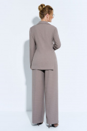 Костюм 2з предметный выполнен из костюмной ткани, состоит из жакета и брюк. Жакет ассиметричного кроя с фигурным вырезом на боку. Горловина жакета - отложной воротник с лацканами , рукав втачной длинный. Изделие на полной подкладке. Брюки- палаццо на притачном поясе с резинкой. изделие с высокой посадкой, в боковых швах брюк расположены карманы. Застежка молния на гульфике.