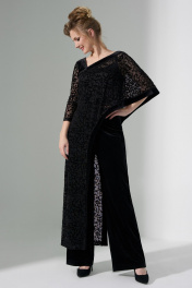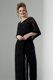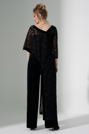 Костюм женский 3х предметный состоящий из брюк , топа и накидки. брюки -палаццо выполнены из велюровой ткани с завышенной талией, на притачном поясе, застежка- потайная молния. Топ на тонких бретелях выполнен из Атласной ткани. Накидка выполнена из сетки с напылением Флок. Изделие ассиметричного кроя, край и одно плечо выполнено из велюровой ткани.