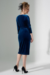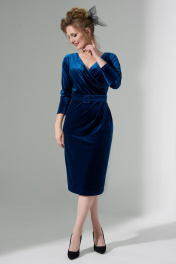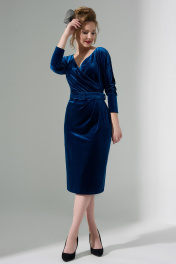 Платье женское выполнено из бархатистой ткани -Велюр. Изделие прилегающего силуэта, отрезное по линии талии. Горловина V-образная, по талии изделия заложены складки наплавленные на лиф платья. Рукав "летучая мышь" низ рукава с широкой манжетой. На спинке расположена потайная молния и таллиевые выточки. В комплект входит пояс с пряжкой, для подчеркивания талии.