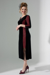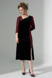 Платье женское приталенного силуэта, ассиметричного кроя выполнено из сочетания бархатной ткани (велюр) и контрастного трикотажного полотна с люрексом. По переду изделия расположены рельефы и декоративная вставка из люрекса. Вырез горловины -фигурный ассиметричный, рукав втачной 3/4. Спинка платья с таллиевыми выточками и потайной молнией.