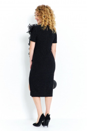 Платье женское прилегающего силуэта выполнена из трикотажной ткани с люрексом, горловина округлая, рукав втачной короткий. По полочке изделия расположен высокий разрез от низа и декоративный несъёмный элемент на груди выполненный из органзы. Спинка платья разрезная с разрезом от горловины и застежкой навесная петля и пуговица.