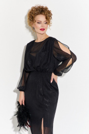 Вечернее женское платье выполнена из шифона с люрексной нитью, изделие длины- макси, отрезное по линии талии, с регулирующей эластичной тесьмой в талиевом шве. По лифу в плечевые швы заложены глубокие складки, декольте прикрыто основной тканью-шифоном. Горловина -округлая, рукав - втачной, длинный, разрезной, по низу рукава манжета с петлей- пуговицей. По центру спинки разрез и декоративные складки от плеча. Юбка платья прямая с высоким разрезом от низа выше уровня колена, застёжка по юбке потайная молния в среднем шве. Платье на частичной подкладке.