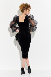 Вечернее платье выполнено из бархатной ткани в сочетании с органзой. Изделие прилегающего силуэта зауженное к низу. Вырез горловины низкий квадратный. Платье на широких фигурных лямках, рукав втачной длинный, с эластичной тесьмой. По спинке изделия расположены таллиевые выточки и средний шов застежка потайная молния