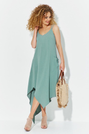 Платье женское свободного ассиметричного кроя, трапециобразного силуэта. Изделие с V-образным верезом горловины, на тонких лямках. По полочке изделия расположены нагрудные выточки и ассиметричный карман Низ изделия ассиметричный, фигурный с глубоким вырезом.