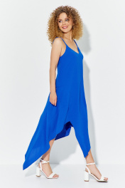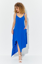 Платье женское свободного ассиметричного кроя, трапециобразного силуэта. Изделие с V-образным верезом горловины, на тонких лямках. По полочке изделия расположены нагрудные выточки и ассиметричный карман Низ изделия ассиметричный, фигурный с глубоким вырезом.