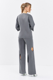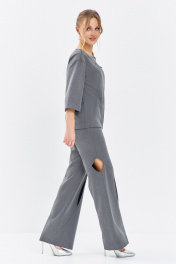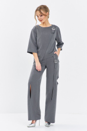 - ОписаниеКостюм женский двухпредметный состоит из блузона и брюк. Блузон женский ассиметричного кроя, свободного прилегания. Блузон ассиметричного кроя, горловина округлая, по полочке расположена ассиметричная планка и декоративный хлястик с пряжкой. Рукав спущенный широкий укороченный с широкой манжетой по низу. Брюки асимметричного кроя, завышенной посадки, на притачном поясе с резинкой по переду брюк расположены функциональные карманы. !!! брюки разрезные по передней и задним частям брюк расположены декоративные прорези (обработанные).