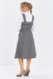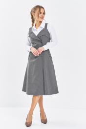 - ОписаниеСарафан женский выполнен из плательной ткани, изделие приталенного кроя, отрезное по линии талии. Сарафан на широких бретелях, по лифу изделия расположены отложные лацканы. Юбка трапециобразная , в боковых швах расположены карманы с клапаном. Сарафан двубортный с застежкой кнопки, в комплектации пояс из ткани основного изделия.