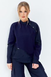 - ОписаниеКомплект женский выполнен в спортивном стиле состоит из кофты и брюк. Джемпер ( кофта) свободного кроя oversize выполнен из сочетания болони и трикотажного полотна. Джемпер с фигурным подрезом по низу и карманом с листочкой, горловина неприлегающая стойка, со смещенной планкой и застежкой на кнопки. рукав приспущенный длинный с манжетой по низу, джемпер на полной подкладке. Брюки широкие карго выполнены из болони, изделие на притачном поясе с резинкой, по бокам брюк расположены объемные накладные карманы. застежка молния на гульфике. низ брюк с кулисой- собирается на резинку. Брюки на полной подкладке.