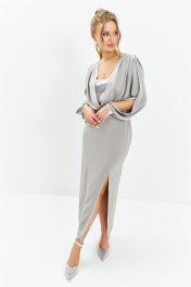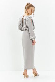 Платье вечернее длинное выполнено из сочетания сатиновой ткани с приглушенным блеском и декоративными вставками из пайеток. Изделие отрезное по линии талии. Лиф платья свободного кроя по плечам и талии заложены глубокие складки, рукав втачной длинный, с декоративными прорезями, по низу рукава расположена узкая манжета из декоративной ткани с застежкой навесная петля-пуговица. Спинка лифа разрезная( разрез обработан закрытыми швами) застежка на горловине навесная петля-пуговица. Юбка изделия прямого кроя с высоким разрезом по переду. Застежка по спинке потайная молния.