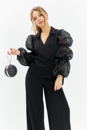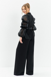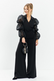 Костюм вечерний с брюками и блузкой женский. Костюм выполнен из сатиновой ткни с приглушенным блеском. Блуза на запах по полочкам блузы расположены нагрудные выточки, горловина V-образная cнебольшим отложным воротником, Рукав втачной выполнен из органзы, низ рукава и перетяжки обработаны резинкой. завязка блузы выполнена из органзы.Брюки палаццо с высокой посадкой расширенные к низу, изделие на притачном поясе с резинкой по поясу, в боковых швах имеются карманы. Брюки без молнии и пуговицы