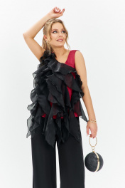 Блуза с настрочными воланами из органзы по полочке, горловина асимметричная, изделие без рукавов, на спинке блузы таллиевые выточки.