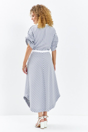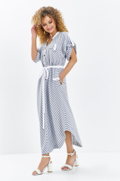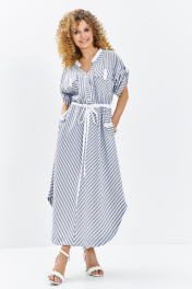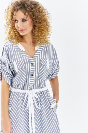 Платье женское выполнено из льна вишера, изделие отрезное по линии талии. Лиф изделия с v-образной горловиной и накладными карманами с клапаном, рукав втачной, приспущенный. На плечах платья расположены паты. По переду изделия планка с застежкой петля-пуговица. Юбка изделия разрезная по центру с совмещенной полоской. В боковых швах имеются функциональные карманы с клапаном. По талии расположена кулиса с поясом-завязкой. Низ изделия фигурный.Принт: Классическая тонкая полоска (диагональная и вертикальная), создающая интересный геометрический эффект. Фасон: Свободный, А-силуэта с акцентом на талии. Нижняя часть платья имеет асимметричный крой или эффект «юбки-тюльпана». Детали талии: Тонкий белый пояс-шнурок, который позволяет регулировать прилегание и подчеркивает силуэт. Верх: V-образный вырез горловины с контрастной белой отделкой. Короткие цельнокроеные рукава с отворотами. Функциональные элементы: Накладные карманы на груди и бедрах, декорированные белыми клапанами, что придает образу легкую спортивную нотку. Цвет: Классическое сочетание серо-голубого (или джинсового) и белого.