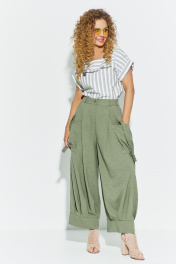 Комплект женский состоящий из блузона и брюк. Блузон прямого кроя с отрезной кокеткой по переду. Рукав приспущенный с манжетой по низу. Брюки высокой посадки с заложенными складками по линии талии и по низу. Изделие на широкой манжете по низу. По брючинам расположены накладные карманы