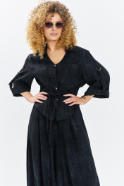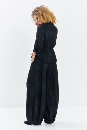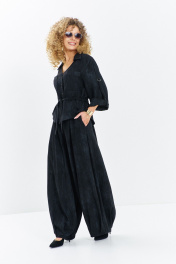 Костюм двойка состоит из блузона и брюк- шаровар. Блузон с аккуратным V-образным вырезом горловины и отложным воротником.на лифе изделия располжены накладные ккарманы и застежка на кнопки. Главный акцент — мягкий пояс-кулиска, который позволяет мгновенно превратить свободный силуэт в приталенный, подчеркивая талию. Рукава с патами позволяют регулировать длину, добавляя образу легкую небрежность. Брюки-шаровары: Роскошный объем, который дарит ощущение абсолютной свободы. Глубокие защипы у пояса переходят в экстремально широкие штанины, создавая эффект летящей юбки при ходьбе. Брюки с высокой посадкой и на притачном поясе с резинкой,застежка молния на гульфике. В боковых швах - карманы которые делают брюки максимально функциональными. Фактура: Ткань с благородным меланжевым эффектом имитирует натуральный лен.