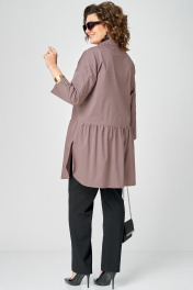 Блуза женская нарядно-повседневная прямого силуэта со спущенным рукавом, выполнена из однотонного хлопка. Вырез горловины отложной ассиметричный воротник, застежка доверху на обметанные петли и пуговицы. Рукав 7/8 втачной, по низу с фигурным элементом и отделочными пуговицами, по низу блузы притачные детали с небольшой сборкой. На левой полочке накладной карман с металлической нашивкой. Низ блузы фигурный, в боковых щвах обработаны разрезы. Декором служат отделочные пуговицы и нашивки.