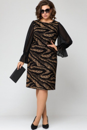 Платье женское нарядно полуприлегающего силуэта слегка расширенное к низу выполнено из трикотажного полотна в сочетании с шифоном. Вырез горловины круглый обработан обтачкой, рукав втачной по низу с воланам. Спинка с центральным швоми потайной застежкой -молнией. По низу спинки обработан небольшой разрез. Декором платья служит дизайн основной ткани.