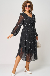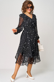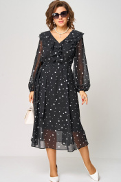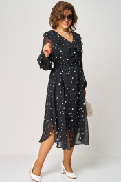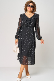 Платье женское нарядно-повседневное полуприлегающего силэта до талии расширенное к низу. Платье отрезное по талии на трикотажной подкладке, выполнено из креп-шифона. Вырез горловины V-образный обработан обтачкой, по горловине полочки и спинки двойные воланы. Рукав втачной по низу на резинке. По юбке небольшие складки. В боковых швах обработаны разрезы, низ фигурный. Декором платья служит съемный пояс из основной ткани и рюши по горловине платья.
