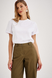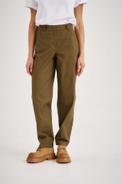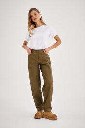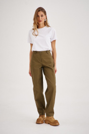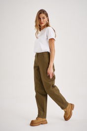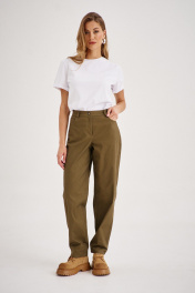 Практичные и стильные джинсы бананы цвета хаки, имеют высокую посадку, тем самым подчеркивая талию и скрывают недостатки в области живота. Брюки выполнены из 95% натурального хлопка, что обеспечивает комфорт и приятное ощущение при ношении. Свободный крой по всему объему бедер, слегка зауженные книзу брючины. Длину брюк можно подвернуть и скорректировать по своему усмотрению. Такие джинсы-брюки прекрасно впишутся в летний образ, подойдут для создания как повседневного образа, так и вечернего. Сочетайте брюки-бананы (слоучи) с черным кроп-топом, блузкой или футболкой с принтом.