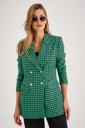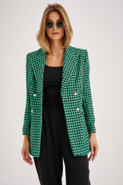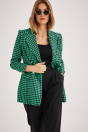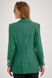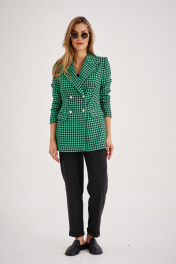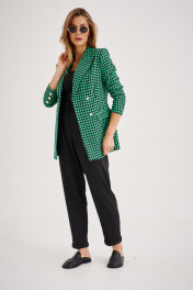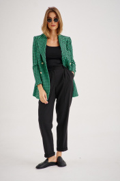 Костюм из приталенного жакета черно-зеленой гусь-лапки может стать базой и для офисного образа, если сочетать с брюками-бананами (слоучи).