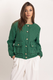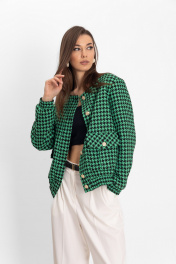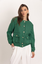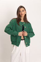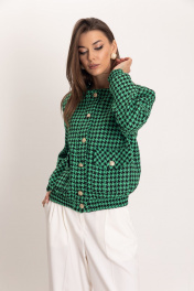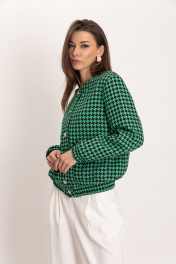Стильный, модный, шикарный комплект: бомбер из черно-зеленой гусь-лапки и брюками-палаццо. Фактурная ткань из вискозы с добавлением полиэстера, отлично держит форму. У модели черно-молочная расцветка с узором гусиной лапки, карманы с клапанами и спущенная линия плеча. Бомбер идеально сочетается с брюками-палаццо прямого кроя с высоким поясом, скрытой застежкой-молнией и боковыми карманами выполнены из натуральной утльтрамягкой поливискозы, обеспечивающей комфортные ощущения на теле. Широкие брюки со стрелками в пол подходят как под каблук, так и под любую низкую обувь. Это идеальный выбор для офисного или праздничного стиля.