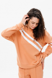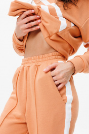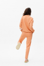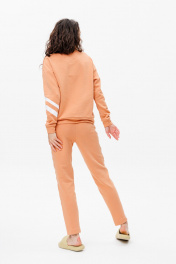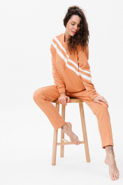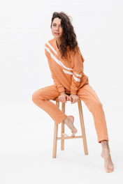 Костюм прямого кроя с белыми полосками по диагонали на свитшоте и по бокам на штанах обеспечит свободу движений, в то время как терракотовый цвет в сочитании с оригинальными полосками выделит вас из толпы.Штаны с карманами ,снизу на резинке. Натуральная дышащая ткань создаст максимальный комфорт и удобство в эксплуатации.Длина свитшота 61 см, длина брюк 109 см