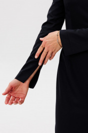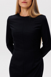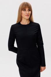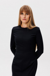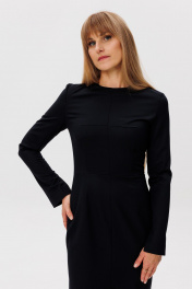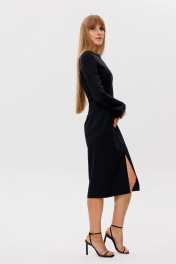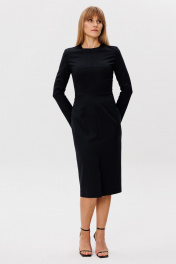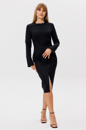 Платье прилегающего силуэта, длиной ниже колена с разрезом внизу. Рукав длинный. Платье визуально вытягивает силуэт и делает вас стройнее.