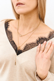 Лонгслив с V-образным вырезом спереди и сзаади, изящно обработан нежным гипюром черного цвета. Мягкий трикотаж, идеальная посадка и утонченная женственность в каждой детали. Длина изделия 64 см