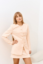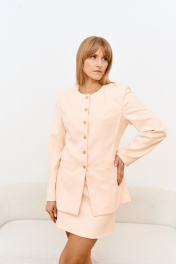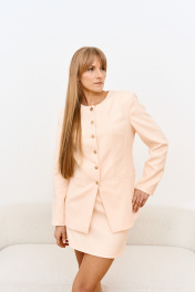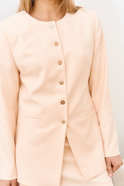 Жакет в нежном персиковом оттенке из повискозы - легкий, комфортный,идеально держит форму и подчеркивает фигуру. Замтежка по центру с акцентными металлическими пуговицами. Длина изделия 72 см