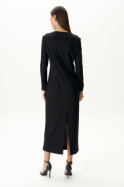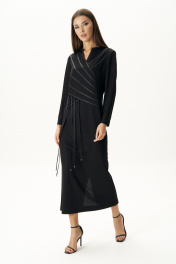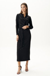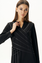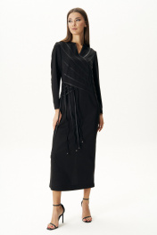 Чёрное платье-символ безупречной элегантности и утончённого вкуса сегодня буквально переживают свою эпоху возрождения. Особенно интересные нетривиальные идеи, воплощённые в их декоративном оформлении. Акцент на талию, и мы моделируем Стройный и изящный силуэт. Платье полуприлегающего силуэта, Втачного покроя с оригинальным вырезом горловины, сложным подрезом, декоративной выстроченной кожаной тесьмой и интригующими шнурами, ассиметрично расположенными с одной стороны. Спинка с центральным швом, талиевыми вытачками, разрезами и застёжкой на потайную молнию. Длина платья около 132 см. Длина рукава около 60 см.