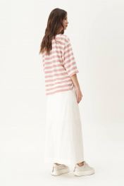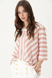 Джемпер свободного силуэта, рубашечного покроя с горловиной, отделочной тесьмой-довязом. Полочка с вертикальным делением и сложным соединением полоски под различными углами. Рукав расширенный в области оката. Длина джемпер около 67см. Длина рукава около 30см.