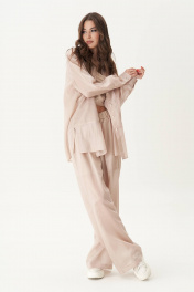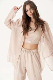 Мода лета 2024 представляет прозрачные ткани, как один из ключевых трендов сезона. Платья из таких полотен уже давно не в новинку, но в этом сезоне к ним мы добавили другую вариацию женской одежды : невероятный брючный комплект, который, развеваясь шикарными складками, создаёт у окружающих иллюзию подглядывания. Свободная, невесомая рубашка, майка-топ и прозрачные брюки с эластичными шортами внутри. Рубашка оверсайз-силуэта, рубашечного покроя с центральной застёжкой, рубашечным воротником со стойкой и рубашечным рукавом на притачной на притачной манжете. Полочка с декоративным подрезом и двухслойной вставкой. Спинка с отрезной кокеткой и мягкой складкой. По боковым швам - разрезы. Брюки в свободном, расслабленном стиле, на притачном эластичном поясе и с подкладкой шортами из х/б трикотажного полотна. Майка-топ их х/б трикотажного полотна с эффектным вырезом, на притачном поясе с декоративным элементом. Длина рубашки около 78 см. Длина рукава с плечом около 74 см. Длина брюк около 105 см.