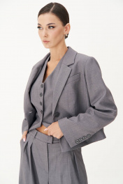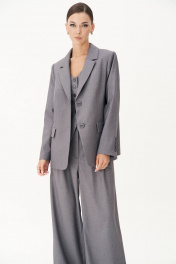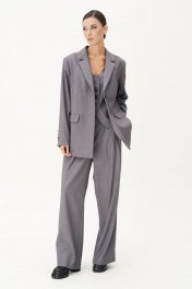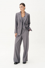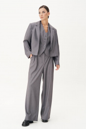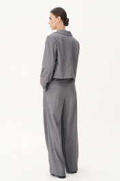 Брюки широкие, на притачном поясе со шлёвками, классической брючной застёжкой на потайные крючки и молнию. Передние половинки брюк с 2-ми мягкими складками-защипами, наклонными боковыми карманами. Задние половинки брюк с вытачками и прорезными карманами с листочкой. Длина брюк около 106 см.