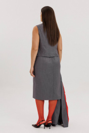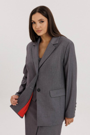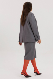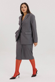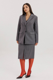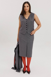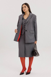 Костюм 3-ка. Жакет свободного расширенного силуэта, втачного покроя с центральной застёжкой и классическим английским воротником. Полочка с отрезным бочком, нагрудной вытачкой и прорезным карманом с клапаном. Спинка с центральным швом, высокой шлицей и отрезным бочком. Рукав двухшовный с отлетной шлицей и отделочными пуговицами. Жилет классический, полуприлегающего силуэта с центральной застёжкой, фигурным бортом и V-образным вырезом. Полочка с отрезным бочком и нагрудной вытачкой. Спинка с центральным швом, отрезным бочком, талиевой и плечевой вытачкой. Юбка классическая длиной миди с притачным поясом, эластичным в области спинки, центральным швом и разрезом по переднему полотнищу. Длина жакета около 76 см. Длина рукава около 62 см. Длина жилета около 50 см. Длина юбки около 74 см.