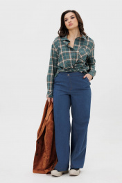 Джинсы wide leg- это модель со свободной посадкой, широкими штанинами и расклешением от бедра. Если классический прямой фасон выглядит формально, то wide leg придает образу более расслабленный вид и за счет расширения книзу, джинсы отлично вытягивают силуэт. Джинсы сложного кроя, с эффектом закрученности: шаговый и боковой шов, застежка смещенные , что создает иллюзию еще большего вытягивания силуэта. Модель свободного кроя, с 5-ю карманами, притачным поясом со шлевками. Длина брюк около 105 см